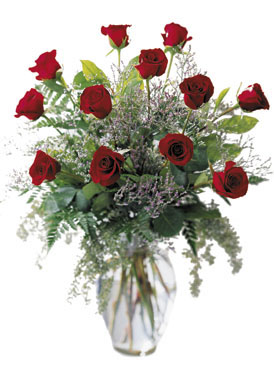 A traditional presentation of one dozen roses in a glass vase.